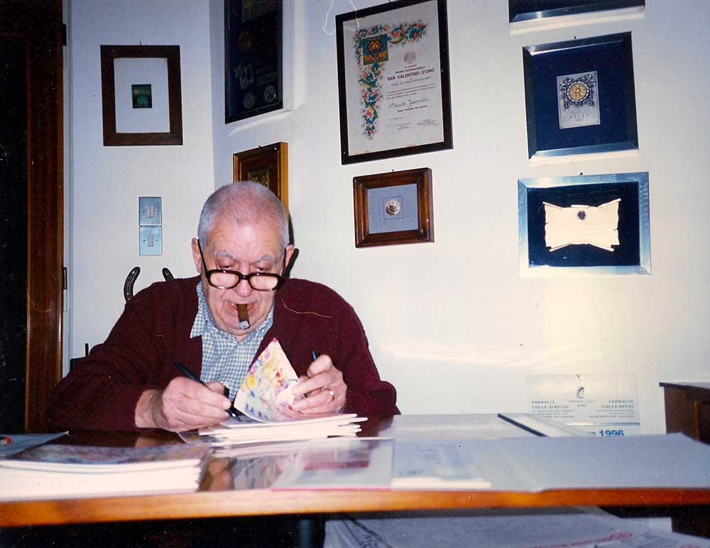Jacovitti nel suo studio autografa le copie del n. 0 di RAP per il Salone dei Comics di Lucca. |