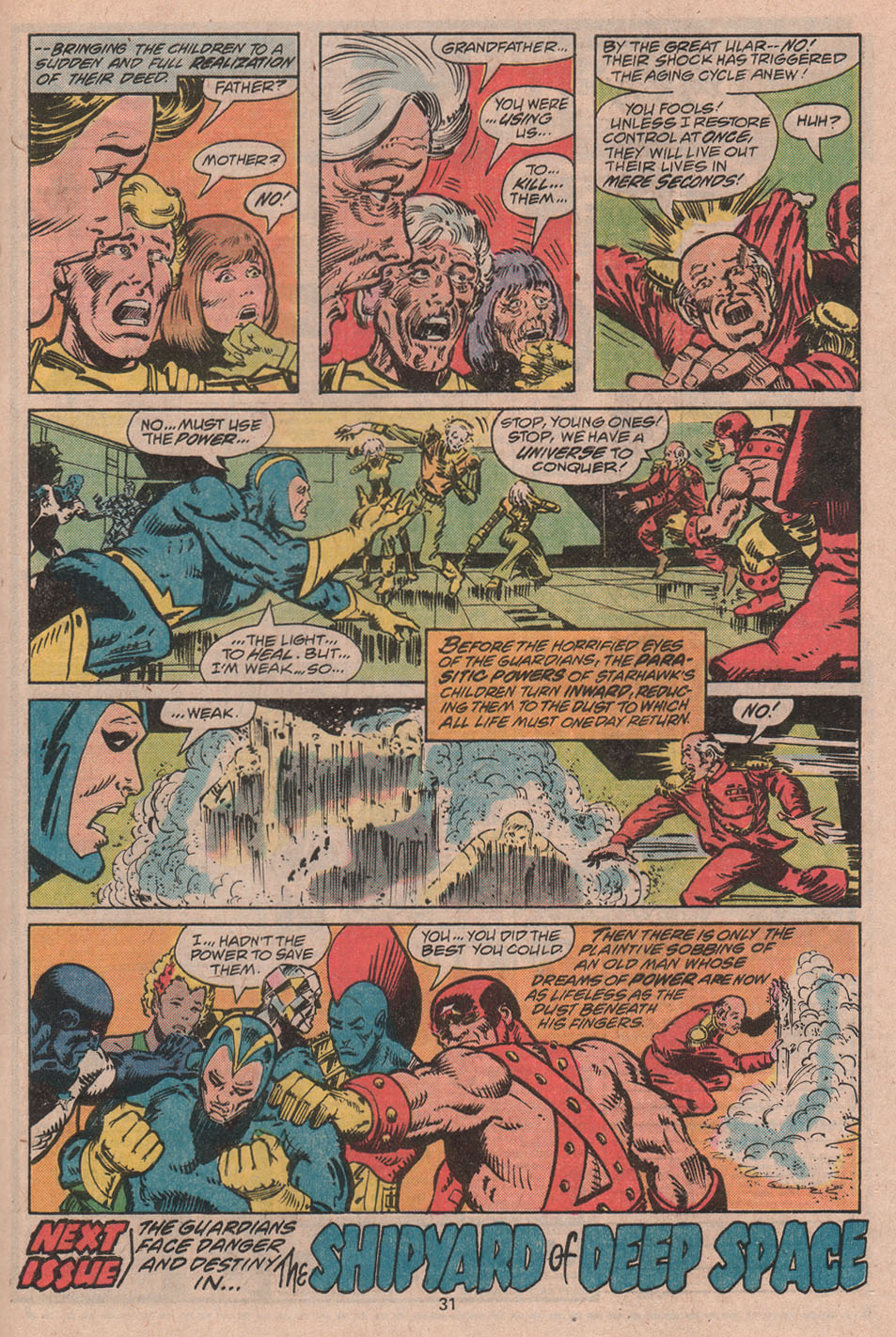 The children attack Starhawk draining him of his life’s energies and this doesn’t change when he swaps places with Aleta. The children are now starting to age. As Aleta nears her end, the Guardians of the Galaxy burst in after landing on the planet in the Kammar and they help turn the tide.