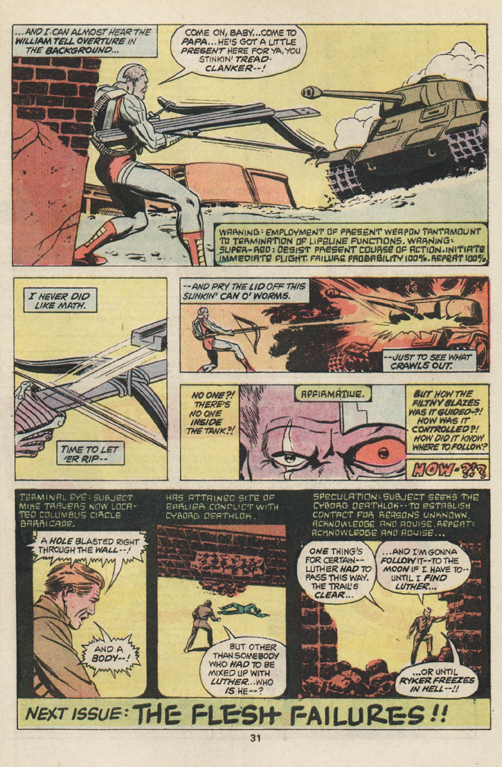 However before he can pull his friend over, enemy gunfire finishes the job. Deathlok is forced to keep running. While the tank takes its time getting past the obstacles in its way, five of Ryker’s mercenaries chase Deathlok on foot.