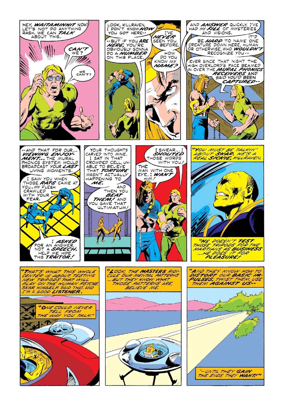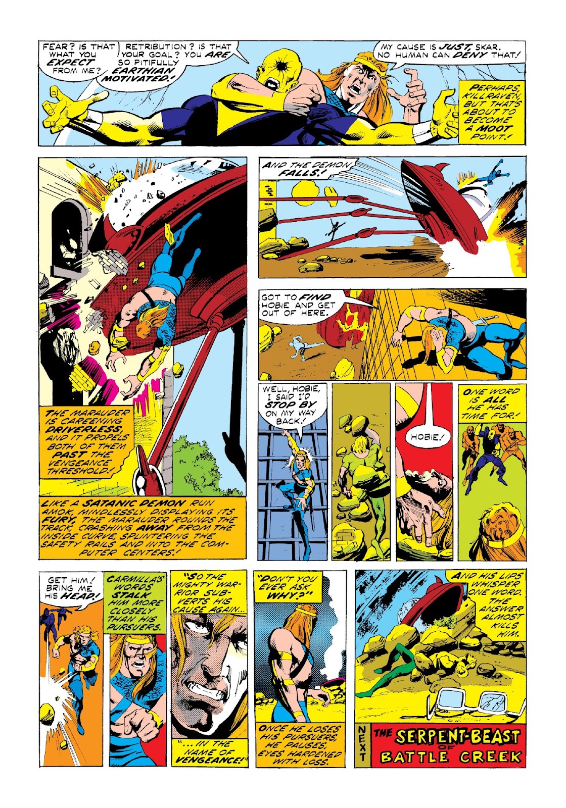 Once inside, he and Skar battle. The tripod, without a driver, leaves the track and crashes into the garage. From the roof Killraven watches as Hobie runs out … and then as a wall collapses on him. Skar survives, but without a working tripod he must let the freemen escape.
