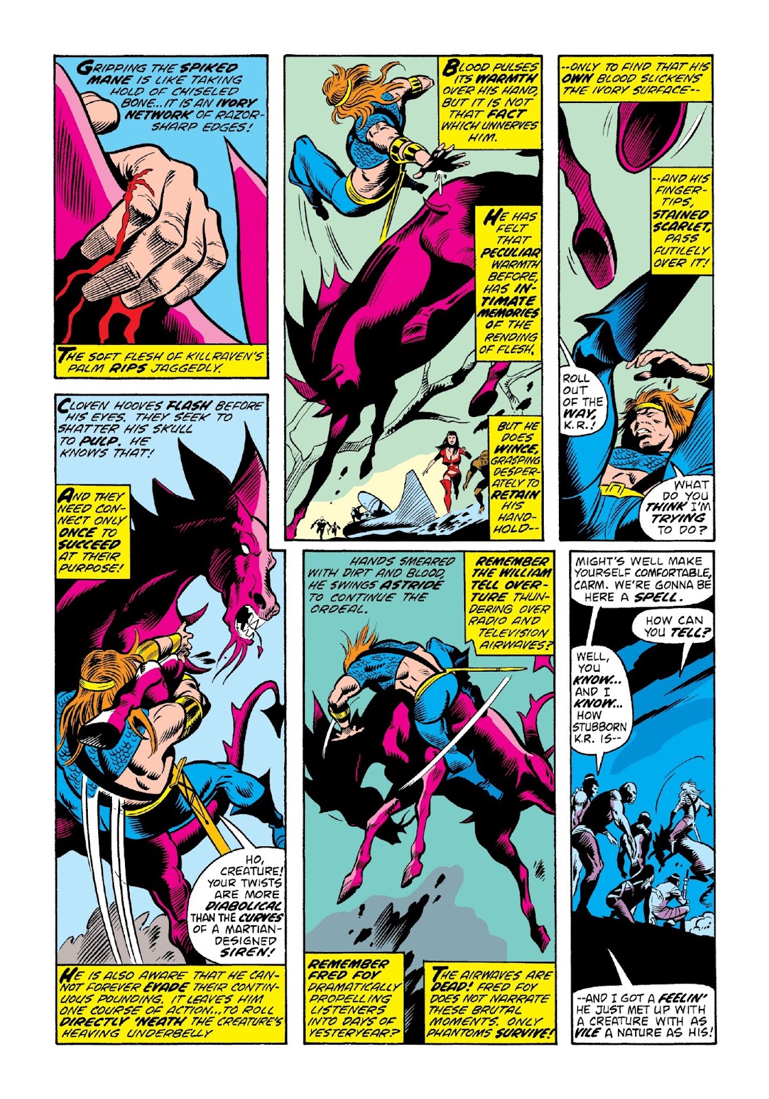 In camp that night, the horse has a bridle. M’Shulla finds a wanted poster with Killraven’s picture. Hawk wonders again why they’re going to Yellowstone. The Martian High Overlord, according to Killraven, said that a Doctor Saunders was there, and a keeper named Saunders killed Killraven’s mother and took his brother.