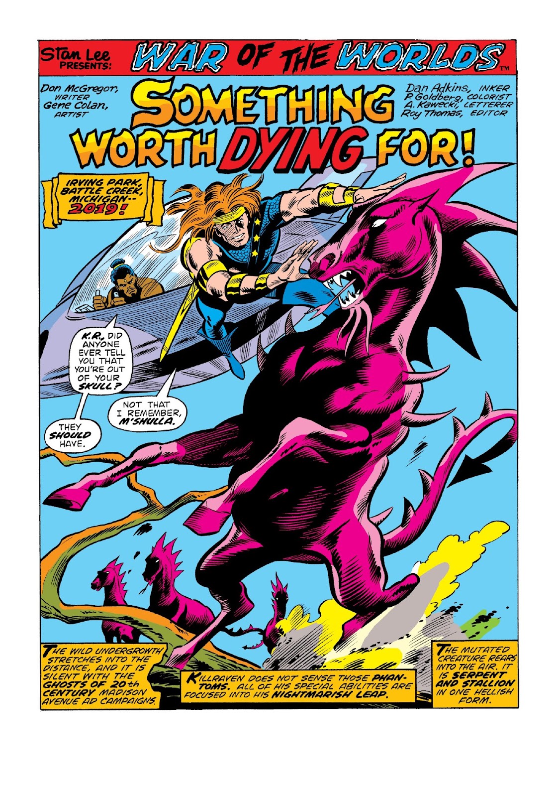 Battle Creek, Michigan, late February 2019. The freemen, on their way to Yellowstone, come across a herd of mutant horses that have the tongues and spikes of reptiles. Killraven drops from a dyna-glider onto the back of a horse, determined to have it for a mount. Their two dyna-gliders have come from Washington, D.C., but the power cells are almost exhausted.
