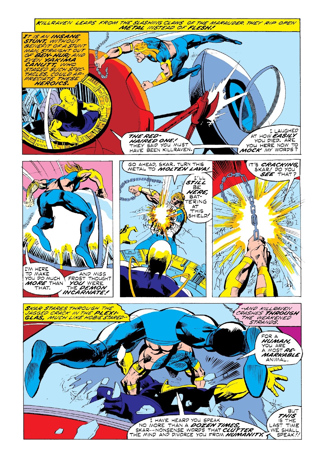 Hobie experienced the mural phonics broadcast of Killraven’s “execution” in Washington (in issue 23, in Italy in CKZ #42) and caught his revolutionary fervor. He helps Killraven hijack one of the tripods and asks to join him. Killraven promises to come back for him. On the track Killraven’s tripod catches up to Skar’s. Killraven makes a suicidal leap to Skar’s tripod and uses a chain to break the canopy.