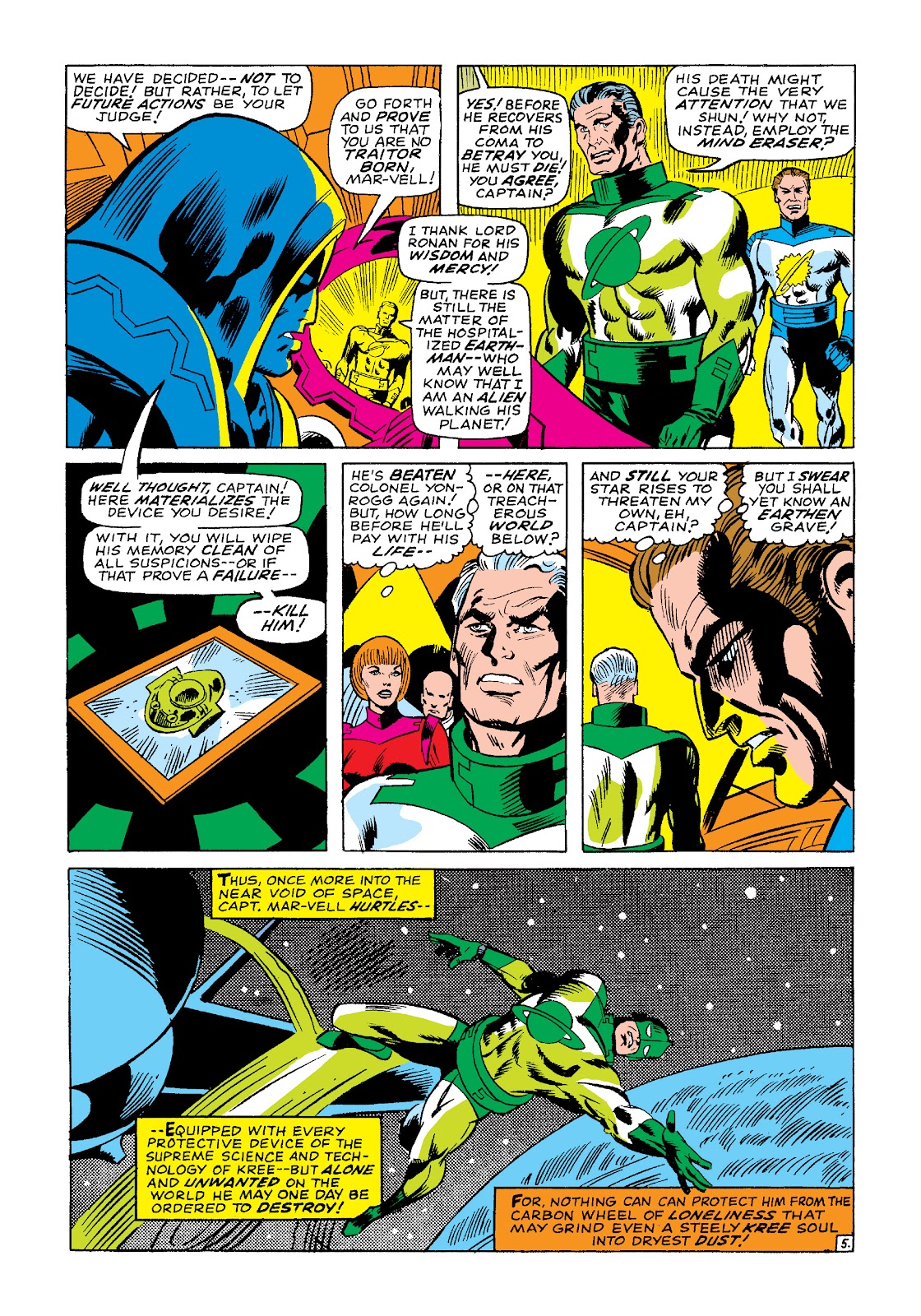 Aboard the Kree vessel over the Earth, Mar-Vell is put on trial by Yon-Rogg for being “Un-Kree” by allowing the Sub-Mariner to win a battle and prevent the people of Earth from being infected with bacteria (as seen last issue.) However, after much consideration, Ronan decides to judge based on Mar-Vell’s actions in able to carry out his mission. He orders Mar-Vell to kill Mr. Logan the one man who may hint at Mar-Vell’s identity.