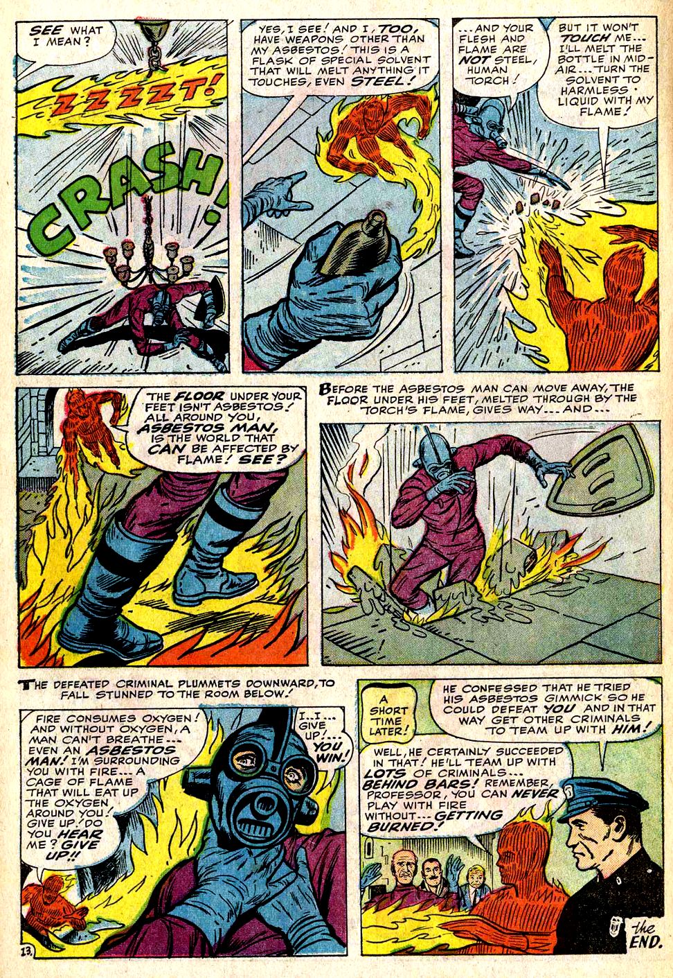 nell’ ultimo episodio di questo albo La Torcia Umana di nuovo solo soletto o quasi è opposto all’incauto Uomo d’Amianto che poi qualche decennio dopo è inevitabilmente morto di tumore ai polmoni, da cui del resto non aveva avuto scampo nemmeno il suo equivalente femminile Victoria Murdock alias Asbestos Lady che aveva rivaleggiato anni prima con la vecchia torcia a petrolio Jim Hammond ed il suo compare Toro