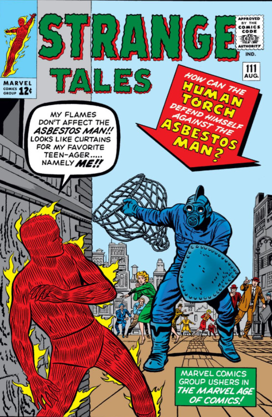 Challenging the Human Torch to a public battle, he manages to outsmart the Human Torch delivering a humiliating defeat to the hero and giving Asbestos Man the credentials to get hired on by a local crime boss. However, when he pulls off an actual crime, the Torch challenges Asbestos Man again, using his flame powers to eat all the oxygen around Asbestos Man instead of trying to burn him, forcing Asbestos Man and his crooks to surrender.