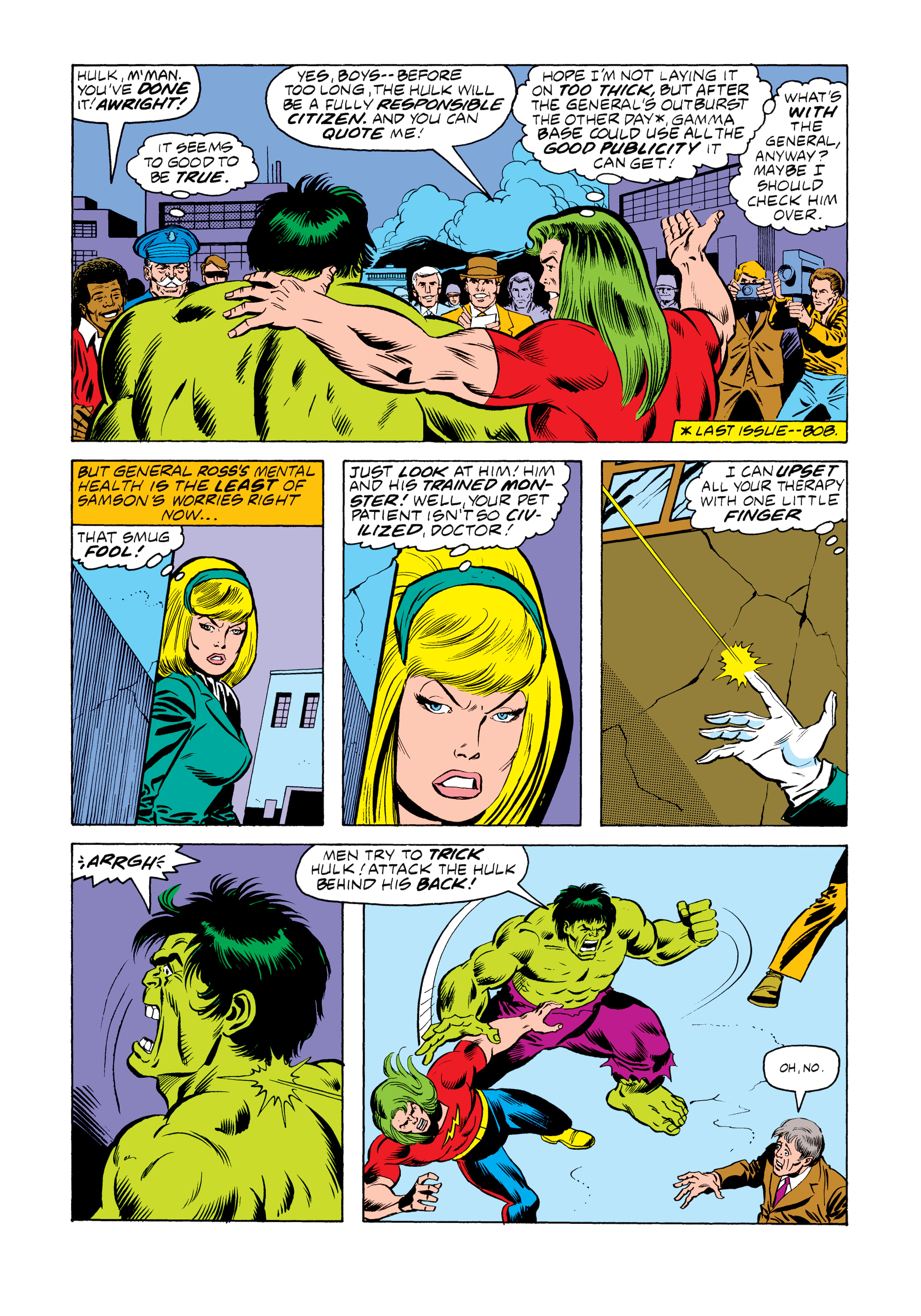 Doc Samson runs up just as the Hulk grabs a hold of Sofen. The