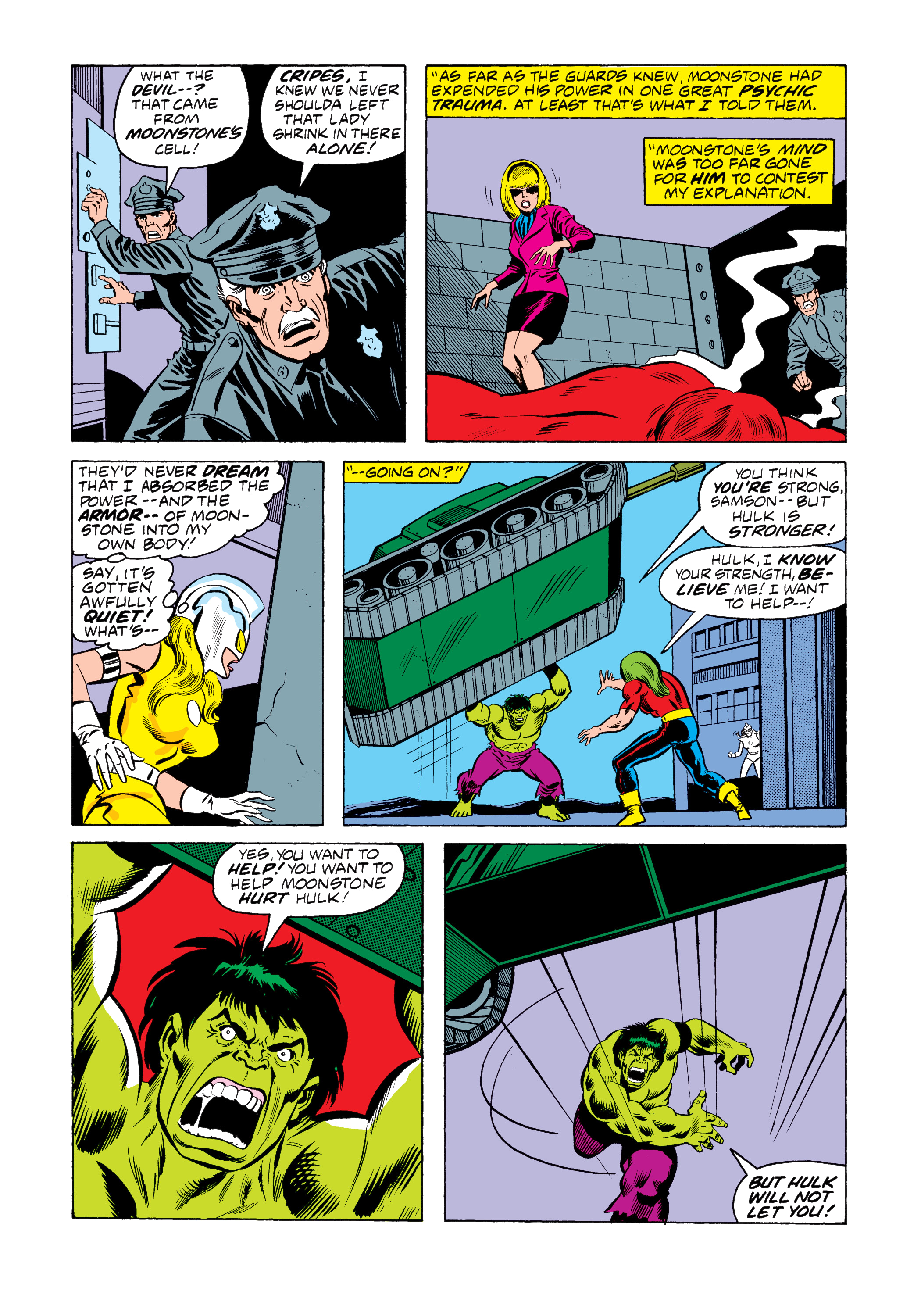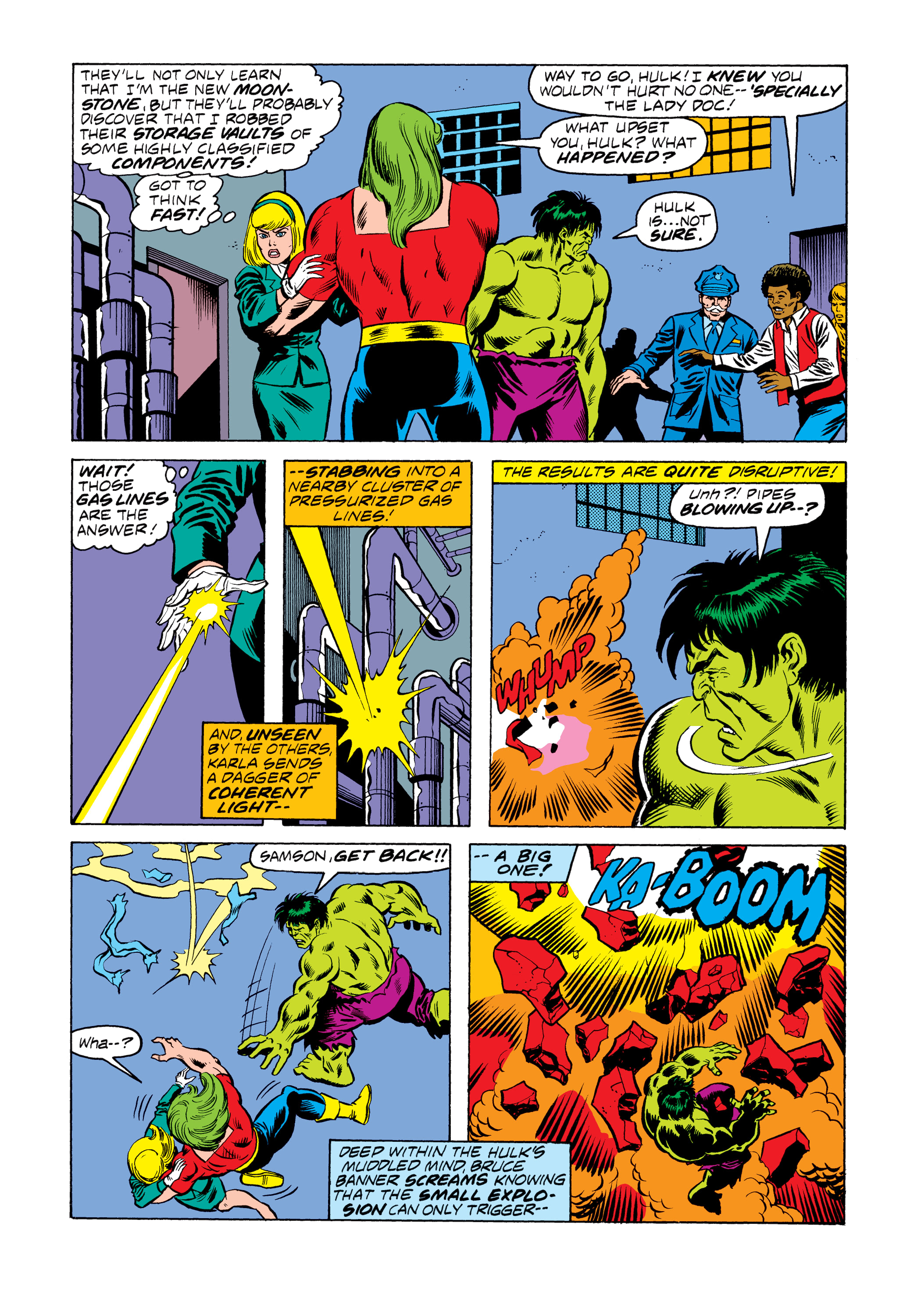 The Hulk effortlessly shrugs Samson off of him, and Moonstone takes
