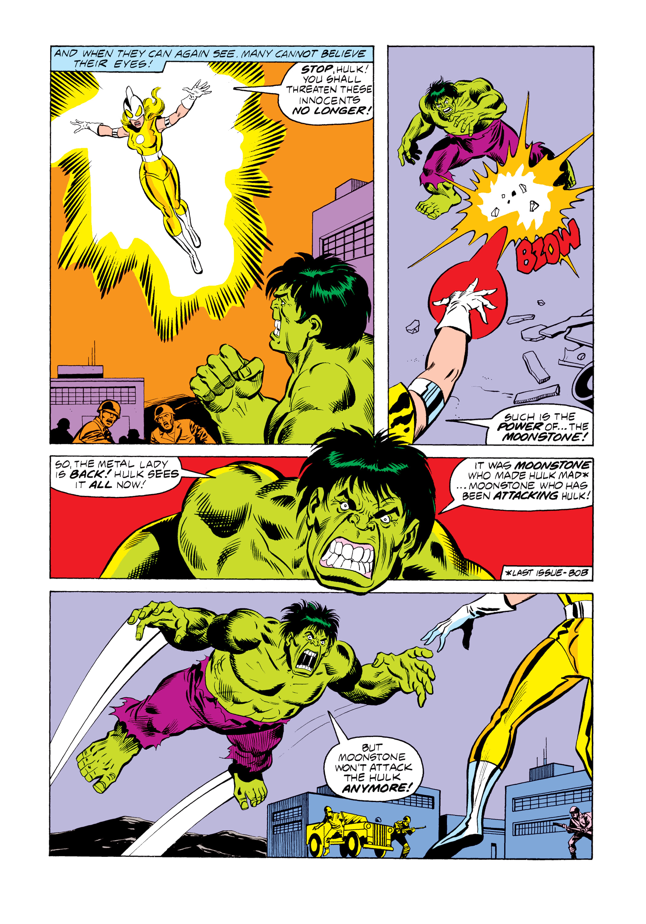 Moonstone returns to the fight just in time to see the Hulk hurl