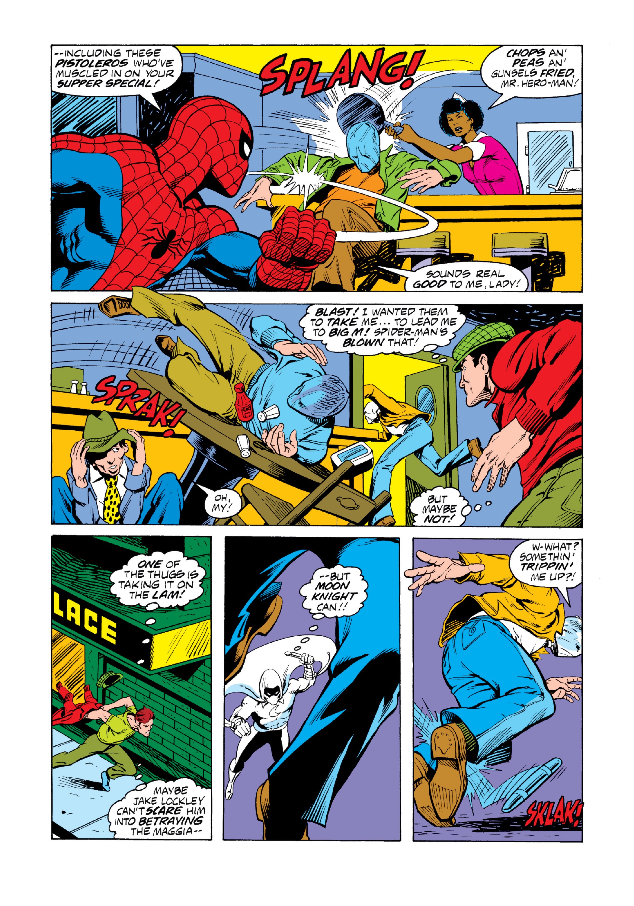 Nell’episodio principale insieme a Spider-Man c’è il pallido e slavato Moon Knight, qui in una delle sue primissime apparizioni (ovviamente mostrando rigorosamente sempre una sola faccia) con l’affettuoso nomignolo italiano di LUNAR. Nella storia compare fugacemente anche la TIGRE BIANCA / WHITE TIGER che poi in realtà è un ispanico meticcio color cioccolato al latte.