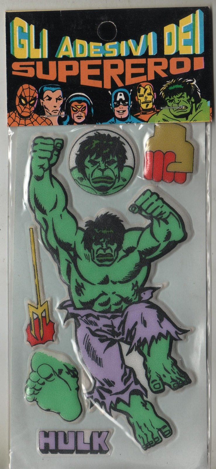 strampalata serie di gadgets marvel non ufficiali a sigla collettiva art. 8486 prodotti abusivamente da una fantomatica ditta di Roma (la New Gio Co.) all’ inizio degli anni ottanta, e venduti in maniera irregolare e frammentaria nelle edicole e nelle cartolerie (i vuccumprà no perchè ce n’erano ancora pochi ed erano quasi tutti tappetari come Toninho Cerezo), ogni confezione contiene un set di adesivi in rilievo, con la figura intera e svariati dettagli, il personaggio di questa è il ciccione ipertrofico HULK che quando esagera col mojito radioattivo gli si ingrossano fegato, palle e muscoli e diventa acido, scontroso e attaccabrighe